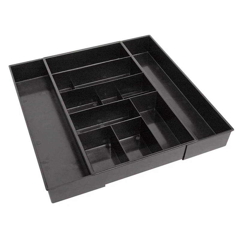 Stay completely organized with this black expand-a-drawer tray. This versatile plastic drawer storage tray will house all different types of office supplies. Help keep miscellaneous items sorted and find drawer items more easily, like cosmetics, brushes, daily necessities, tableware, jewelry, tools, pencils—you get the idea. Perfect for any drawer and will go with any decor.