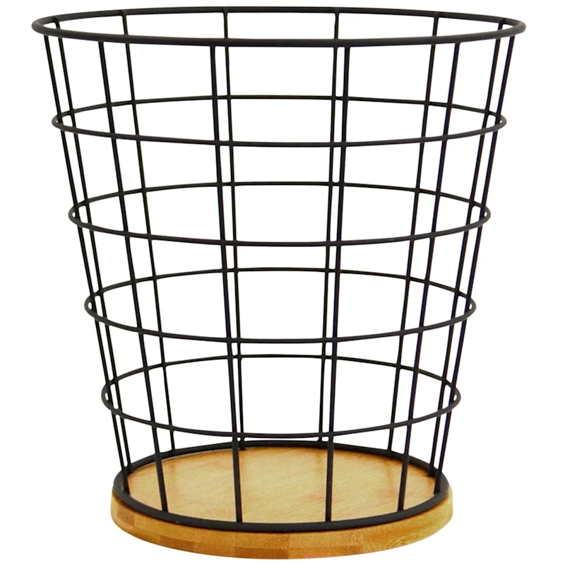 Matte Black Wire & Bamboo Wood Tapered Waste Bin, 10.3"