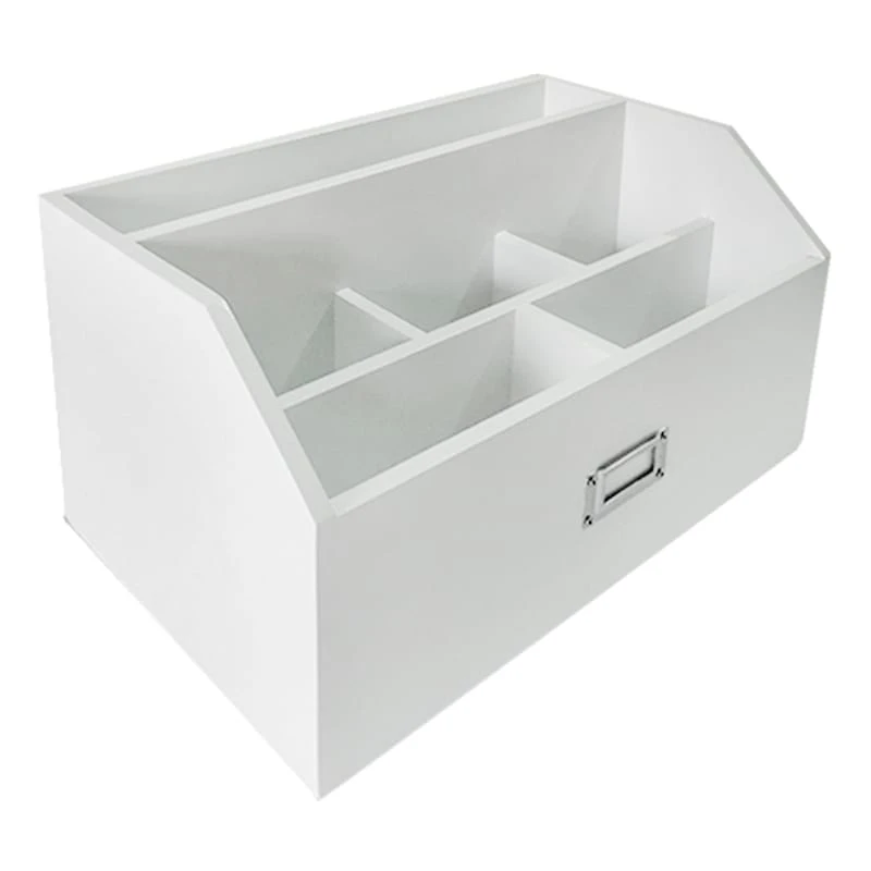 Keep small office supplies organized and within easy reach with this white wood desktop organizer. Made of wood and manufactured wood for strength and durability it has a bright white finish for a clean, farmhouse design that will compliment almost any decor. The multiple compartments offer storage for paper clips, tacks or other small supplies that need to be kept close at hand.