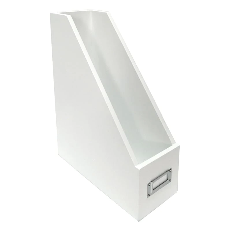 Keep magazines and catalogs organized and within easy reach with this white wood magazine holder. Made of wood and manufactured wood for strength and durability it has a bright white finish for a clean, farmhouse design that will compliment most any decor. The large open storage slot will make it easy to categorize and house magazines and files. The label slot on the front makes it easy to identify what’s inside.